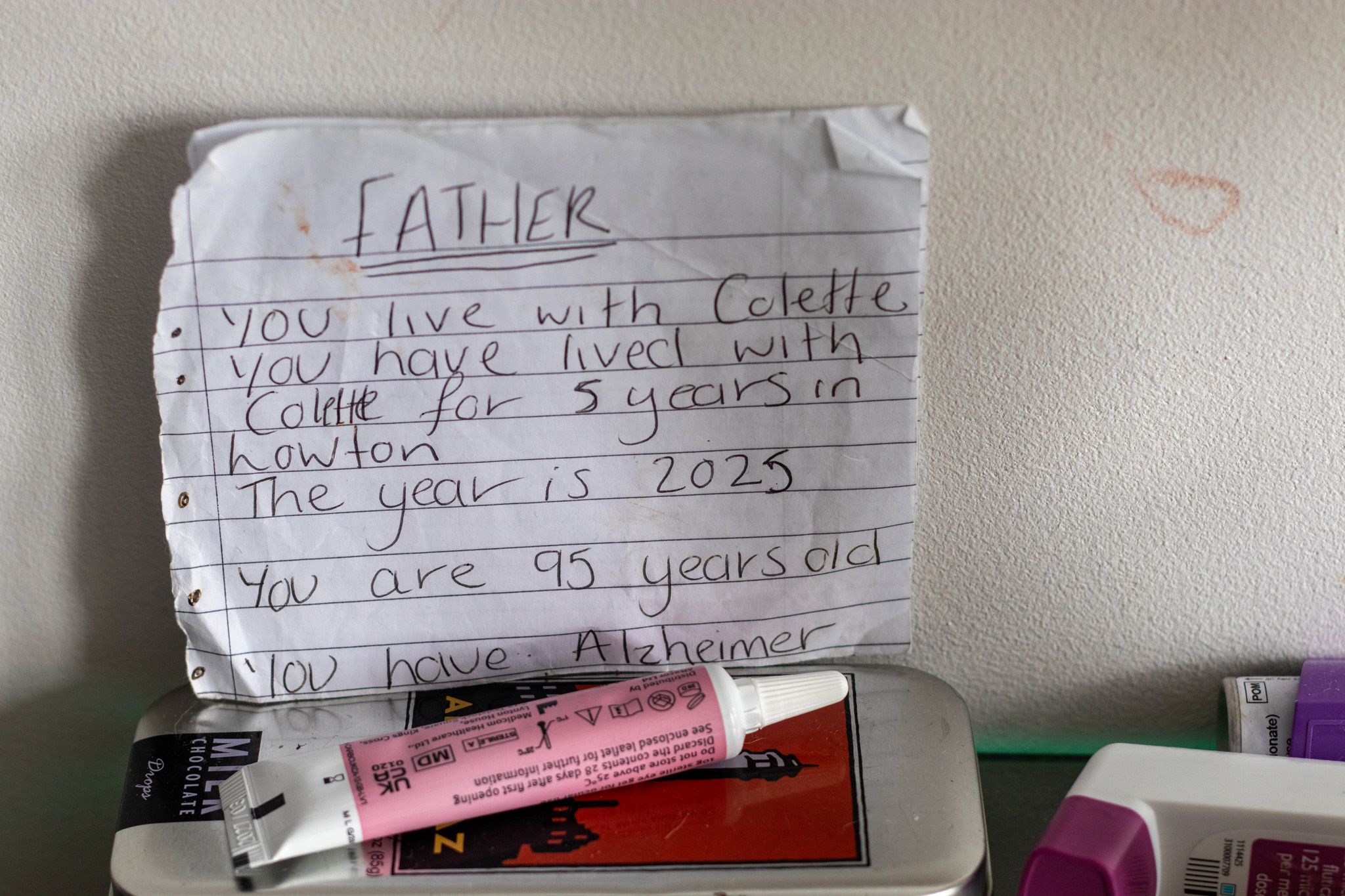 A handwritten note in her uncle’s room reminds him who Collette is and that he has Alzheimer’s.
