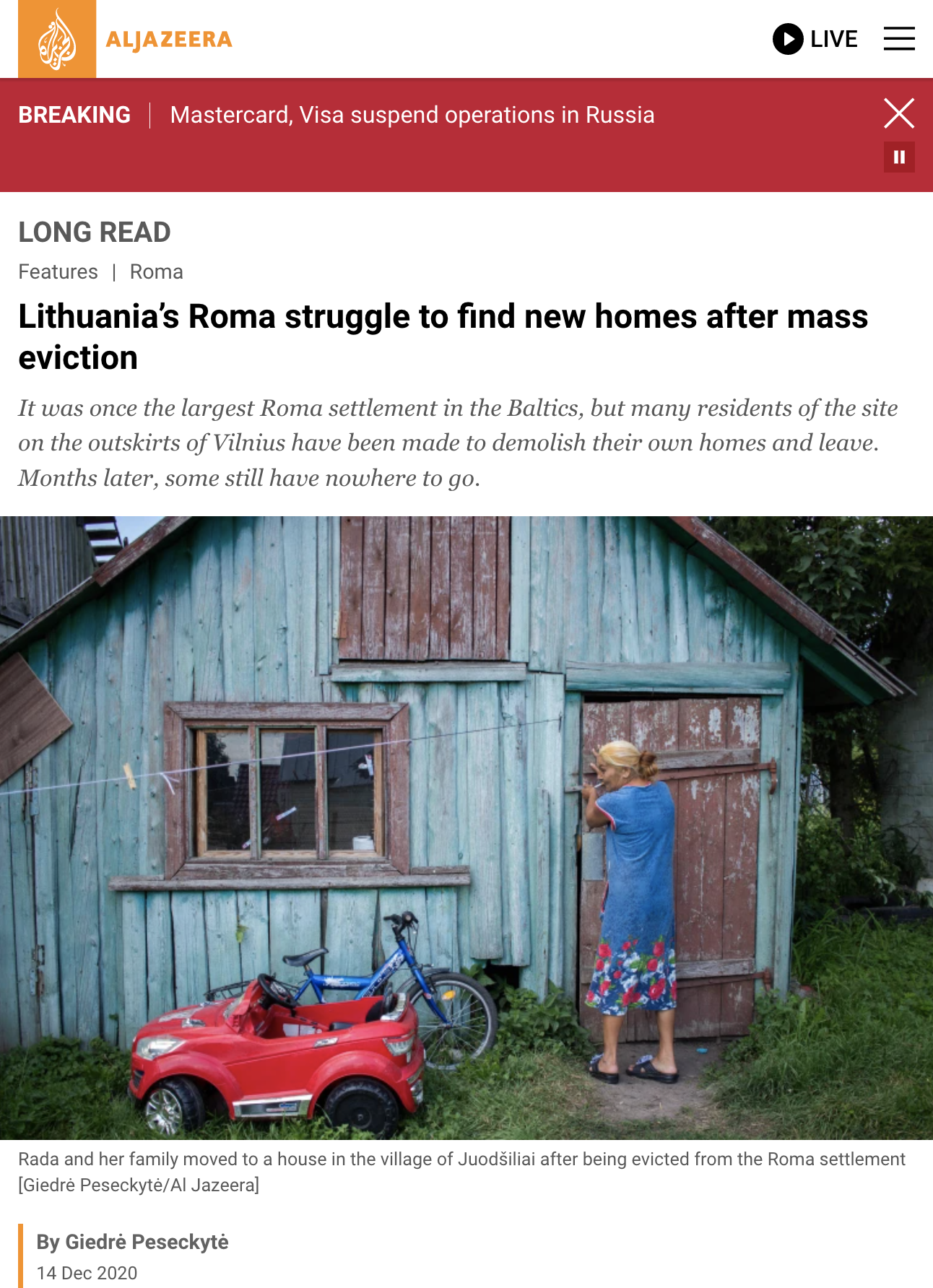 - Lithuania's Roma struggle to find new homes after mass eviction, by Giedrė Peseckytė, follows a Roma community’s struggle to find new homes. The long-form text, photo and video piece was published by Aljazeera and Nara a multimedia publication co-founded by graduate student Berta Tilmantaitė.