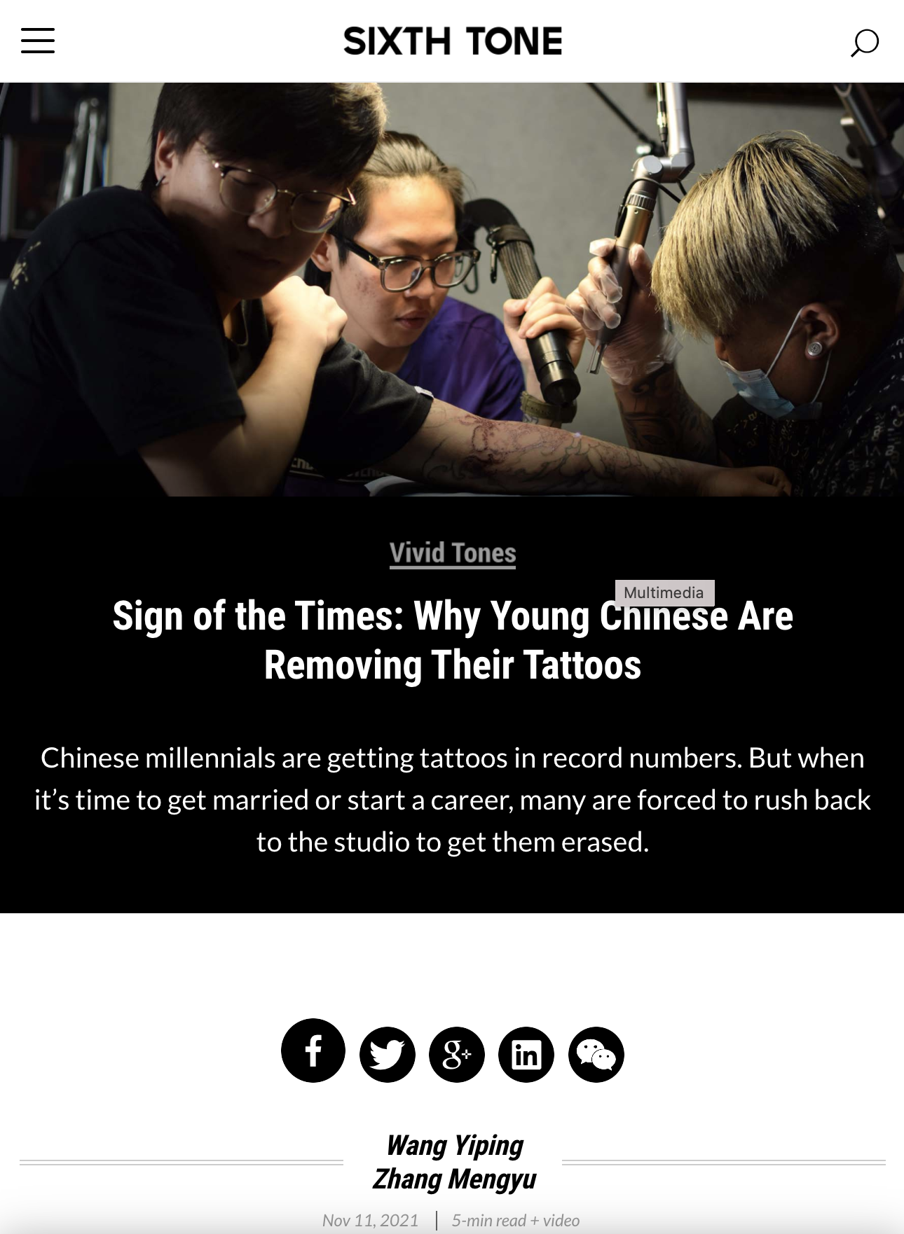 - Why Young Chinese are removing their tattoos, by Wang Yiping and Zhang Mengyu covers the growing trend of tattoo removal in China. The story was published in Sixth Tone.