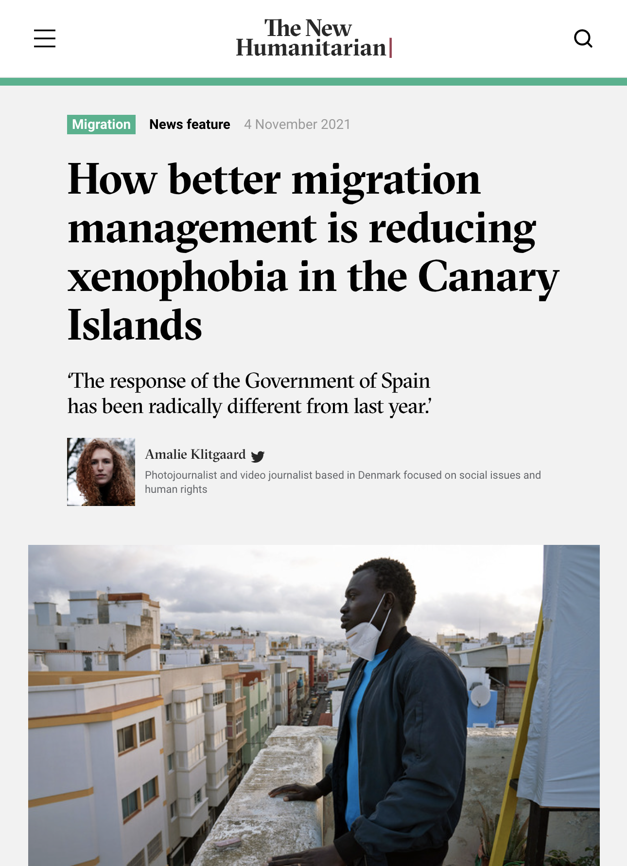 - How better migration management is reducing xenophobia in the canary islands, by Amalie Klitgaard is a long-form multimedia story exploring recent ebbs and flows of hostility and racism toward migrants in Spain - and the forces that impact them.